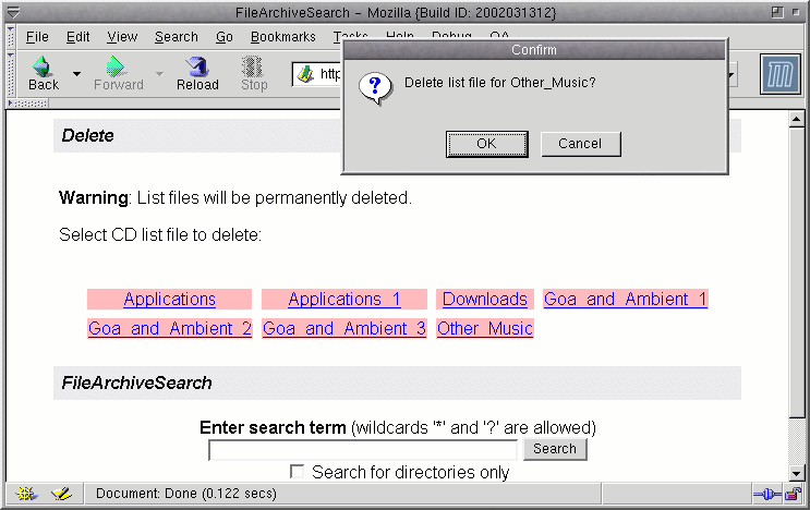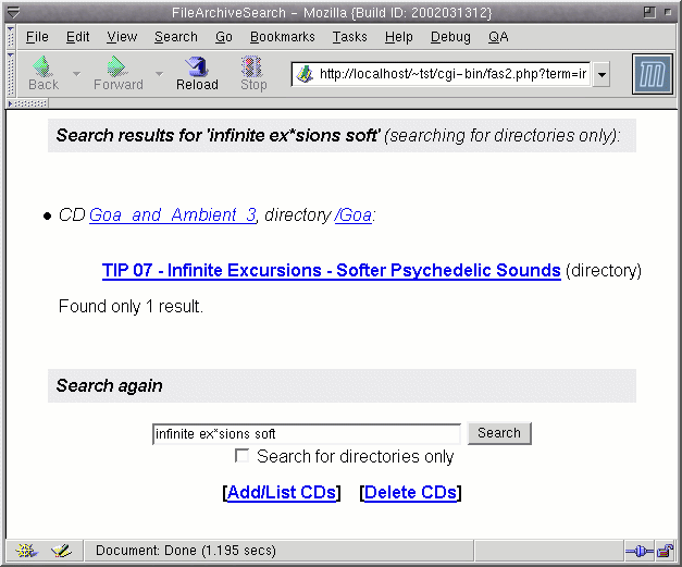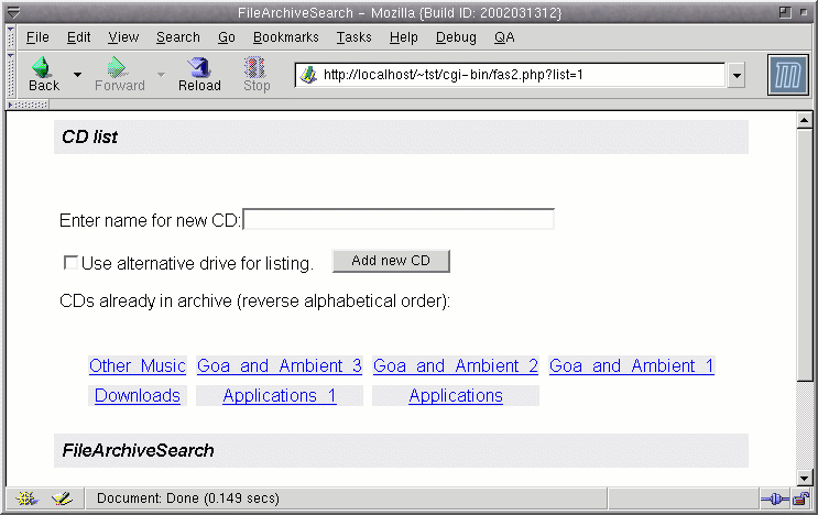 | screenshots Here are a few screenshots of the FAS web interface: Note that the screenshots here show only a small amount of list files. That is simply because I don't want to disclose my complete CD collection to the entire world. FAS has been tested extensively with several hundred CDs in the archive, and it still works fine and is fast. |