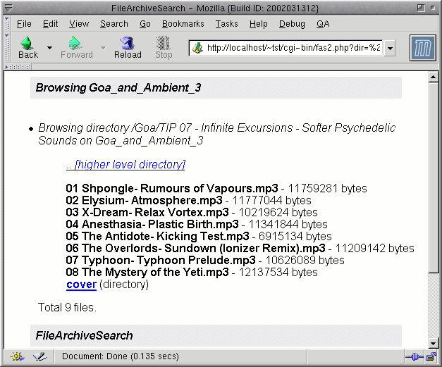 In addition to the media collection, local directories (e.g. your download dir or the incoming dir of a local ftp site) can be included in the search. FAS is also useful for those who run a private media/software distribution FTP site: to allow users to do easy dupechecking before uploading, and to allow users to request stuff available only offline on CD. For advanced features, see the FAS README file. FAS requires apache and PHP4, but does not require any database. It is fast and has very little overhead. The CD list files are stored in a simple, standard format (ls -lR redirected to a file). You can create list files on any UNIX system, even without having FAS installed. Searching is done via shell scripts, using grep, and can easily be customized. FAS is freeware (GNU GPL). |